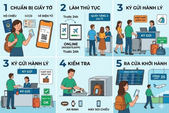 2. Làm thủ tục (Check-in): Bạn có thể chọn check-in trực tuyến qua website/app của hãng trước 24h để tiết kiệm thời gian, hoặc làm tại quầy thủ tục ở tầng 2 nhà ga T1.