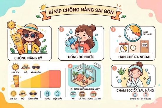 - Hạn chế ra ngoài giờ cao điểm: Từ 11h – 15h là thời điểm nắng gắt nhất.